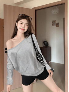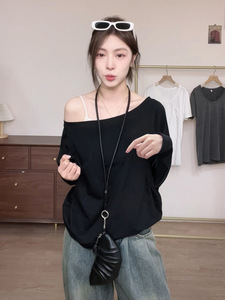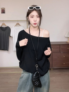 早秋装2025同款黑色斜角肩长袖T恤女打底衫一字露肩慵懒上衣