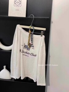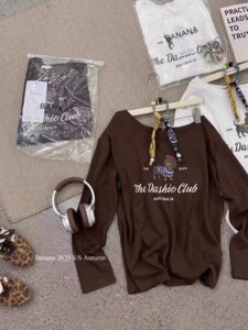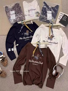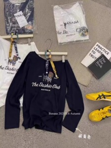 韩国东大门秋季新款复古卡通小狗斜肩长袖T恤女宽松显瘦露肩上衣