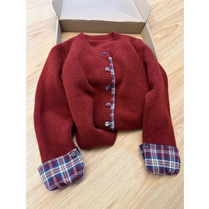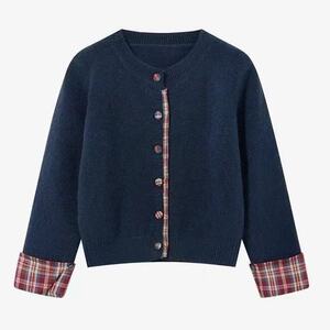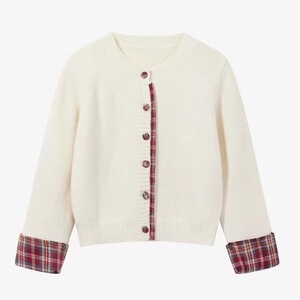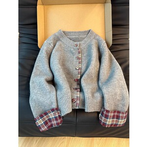 2025秋冬季学院风假两件针织开衫女宽松休闲格子拼接毛衣外套女装