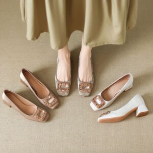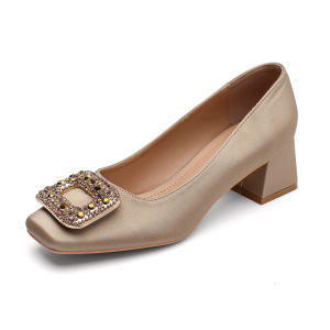 复古粗跟单鞋女2025春秋新款中跟浅口奶奶鞋方头法式钻扣玛丽珍鞋