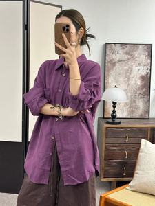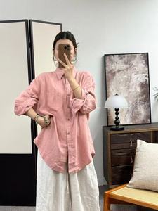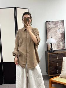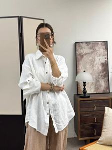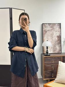 2025秋季韩版宽松简约砂洗亚麻贴布口袋中长款衬衫开衫百搭衬衣女
