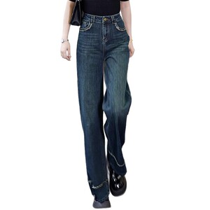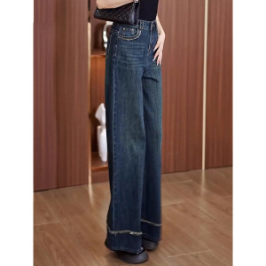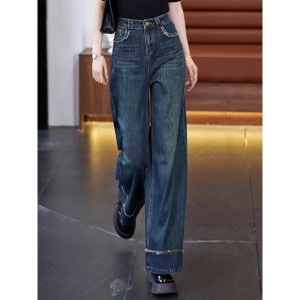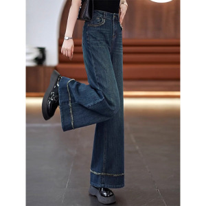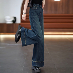 复古深蓝色阔腿牛仔裤女春秋2025新款高腰垂感遮胯毛边大脚直筒裤