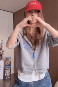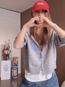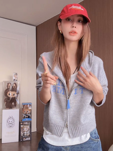 灰色针织开衫女秋季新款双拉链字母绣花连帽上衣短款慵懒毛衣外套