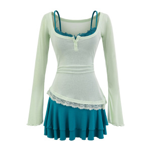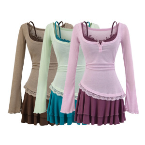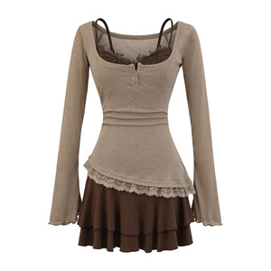 真两件纯欲蕾丝连衣裙女秋季收腰设计感绝美长袖T恤吊带短裙套装
