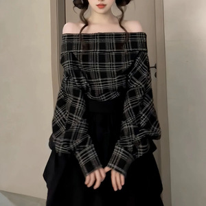 气质一整套ootd穿搭复古黑色格纹一字肩上衣半身裙两件套装2025秋