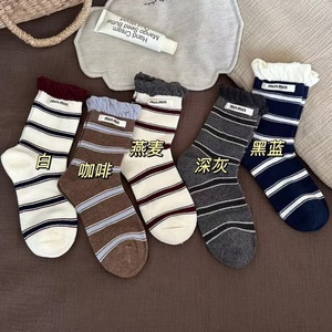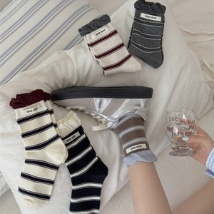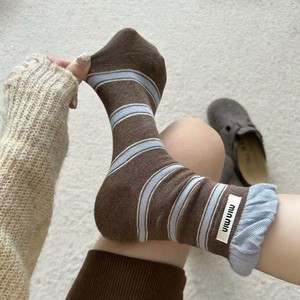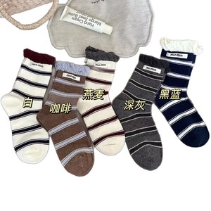无骨条纹袜子女撞色双罗口字母布标中筒袜百搭吸汗透气ins堆堆袜