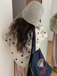 韩版圆领波点针织开衫女2025秋冬新款宽松慵懒风百搭软糯毛衣外套