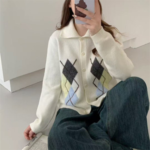 韩系秋冬季新款菱形格提花针织毛衣女外套文艺复古风百搭翻领开衫