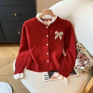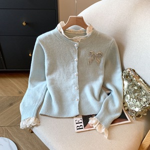 法式甜美风花边烫钻蝴蝶结针织开衫女秋冬季新款温柔软糯保暖毛衣