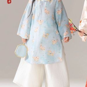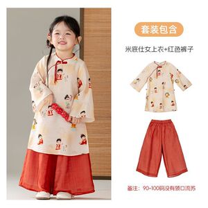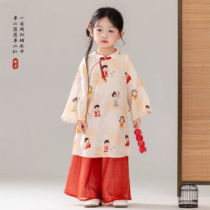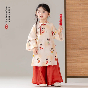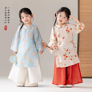 汉服女童2025秋季女孩中长款外套裤子两件套新中式国风套装演出服