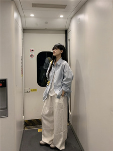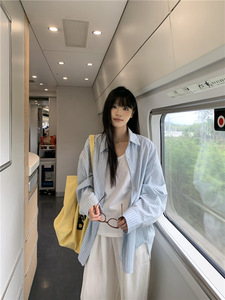 韩系松弛感廓形宽松奶蓝色条纹长袖衬衫外套上衣女春夏秋防晒衬衣