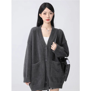 灰色中长款毛衣外套女春秋外搭日系慵懒复古奶系穿搭软糯针织开衫