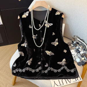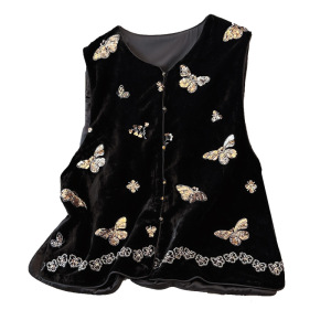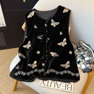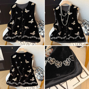 新款刺绣钉珠拼接丝绒马甲女秋季新款宽松上衣2025年大码欧货坎肩