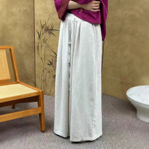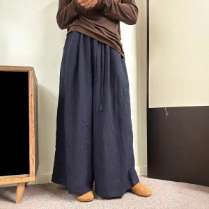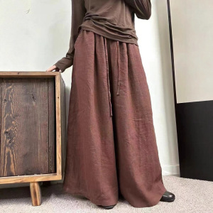 2025秋季韩版宽松文艺复古风砂洗亚麻松紧腰阔腿裤百搭休闲裙裤女