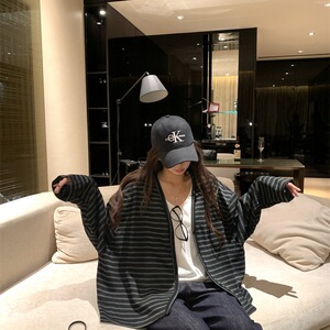 慵懒风撞色条纹气质宽松长袖T恤外套女秋季显瘦百搭休闲开衫上衣