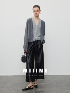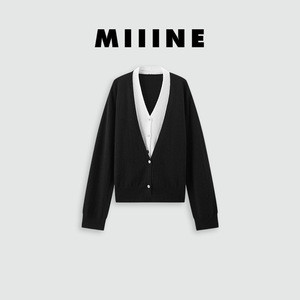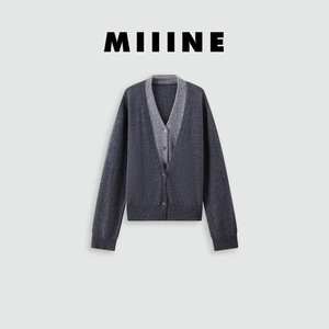 Miiine叠穿假两件V领灰色撞色开衫外套 羊毛针织衫初秋独特上衣