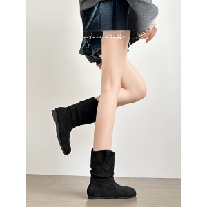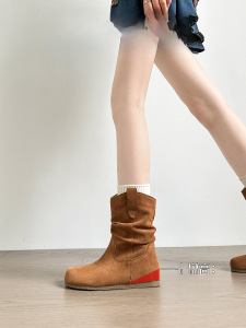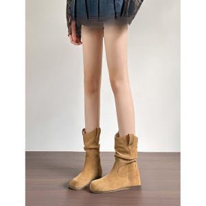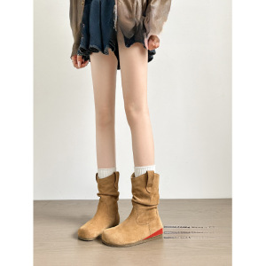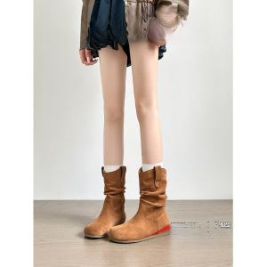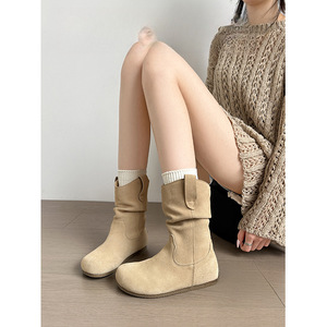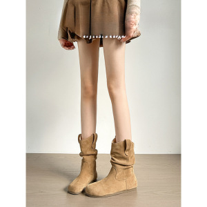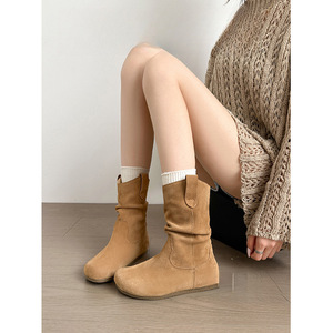 牛皮版~棕色短靴女褶皱堆堆靴新款美拉德勃肯西部牛仔靴