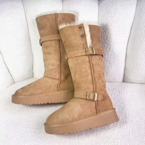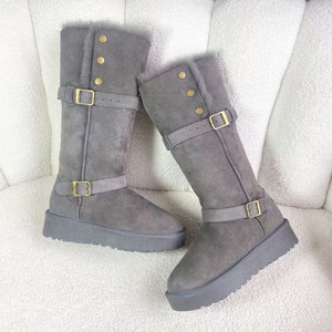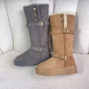 新款高帮女士雪地靴羊皮毛一体女靴秋冬保暖防滑厚底骑士靴皮带扣