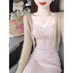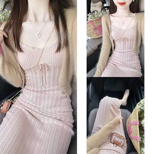 两件套单件时尚百搭外穿遮肉小开衫针织衫+温柔高级连衣裙套装女