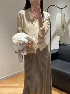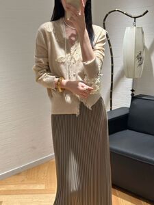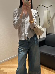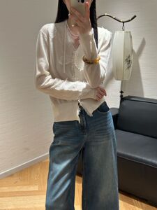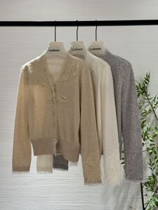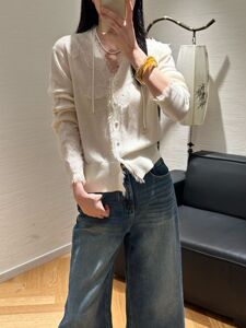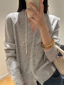 港米欧洲站25早秋细腻软糯100羊毛针织毛边钩花亮钻V领女人味开衫