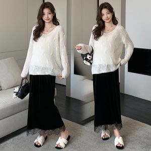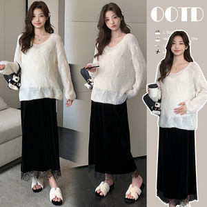 孕妇装秋季新款镂空V领毛衣+丝绒蕾丝边半身裙甜美时尚气质款套装