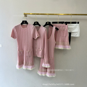 深圳南油高版本CH家25早秋新款流苏撞色圆领针织短袖连衣裙子