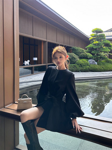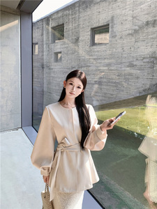 外套女秋中长款设计感气质宽松显瘦圆领灯笼袖绑带a字西装连衣裙