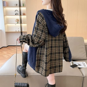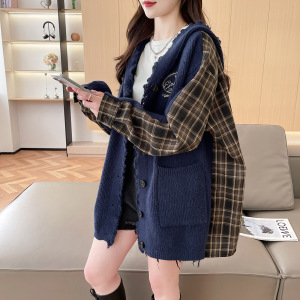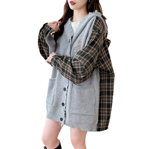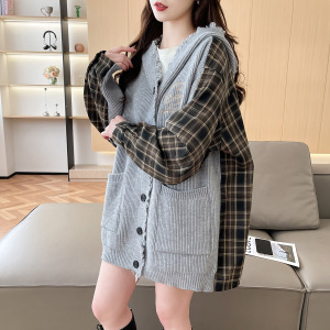 韩版外套口袋连帽格子拼接毛衣女秋冬新款针织衫长袖宽松休闲外搭