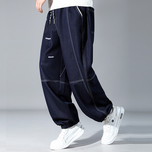 束脚阳离子牛仔裤大码男潮流拼接小字母刺绣裤子运动百搭收脚长裤