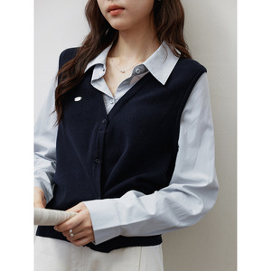 【一秒叠穿术】歌铭秋季假两件毛针织马甲背心拼接长袖衬衫N566C