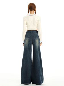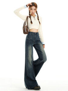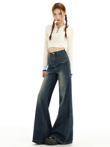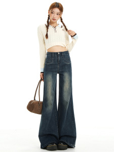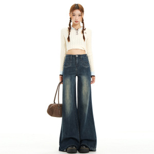 复古蓝高腰无腰头设计显瘦宽松喇叭牛仔裤女2025秋新款垂感亲肤潮