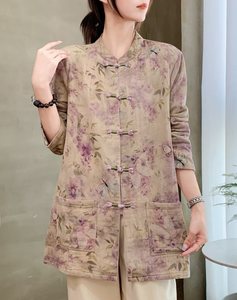 2025款秋季斜纹麻棉国风开衫棉纱文艺数码印花中长款女士盘扣外套
