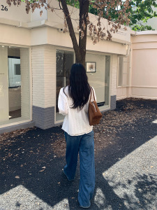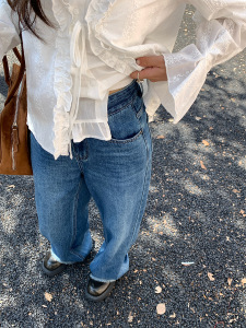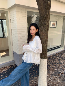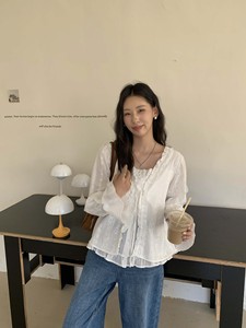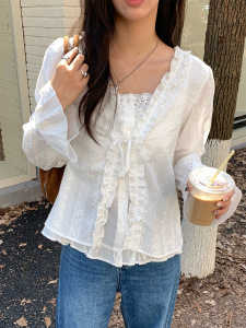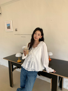 广州黄峥法式木耳边系带刺绣v领衬衫早秋宽松长袖上衣小衫530929