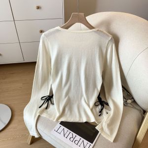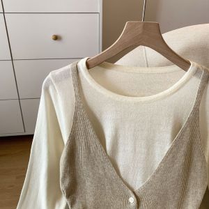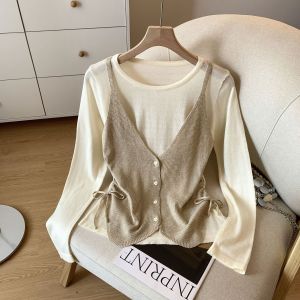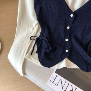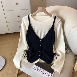 十三行温柔风抽绳长袖假两件针织衫女2025秋季修身设计感拼接毛衣
