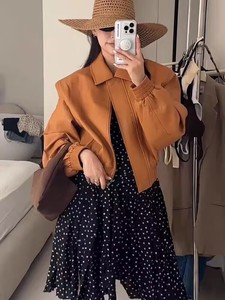 高端25春秋新橙色夹克短款拉链美式复古港风小个子爆款皮衣外套女