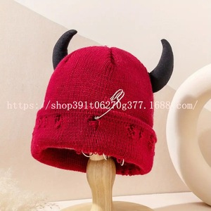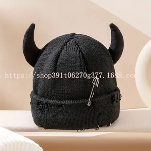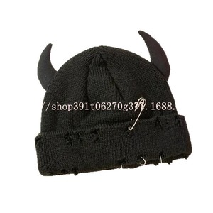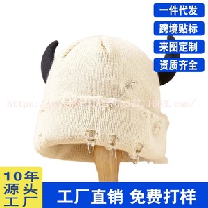 女士瓜皮帽圆环别针针织帽韩版新款潮破洞帽2020新亚马逊外贸帽子