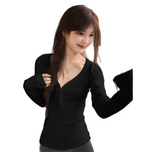 设计感小众V领棉长袖T恤女秋冬内搭短款打底衫辣妹修身显瘦上衣新