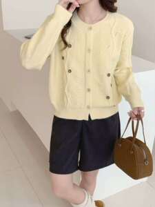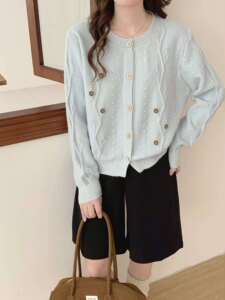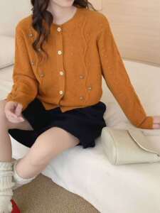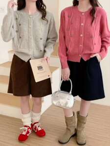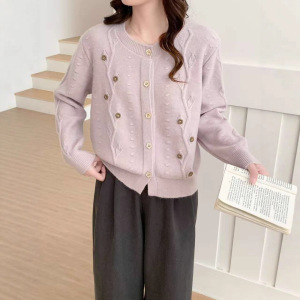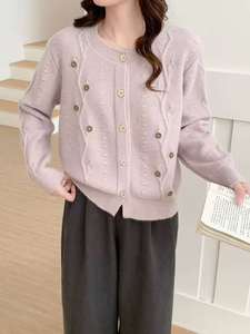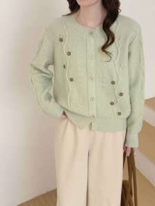 休闲百搭宽松时尚气质针织衫毛衣刺绣花朵单排多扣圆领秋冬毛衣