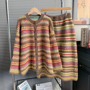 复古民族风撞色条纹彩色毛衣开衫女套装秋冬新款针织半身裙两件套