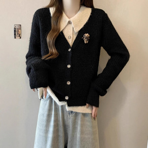美拉德咖色翻领正肩毛衣外套女2025春秋款大码胖mm假两件针织开衫