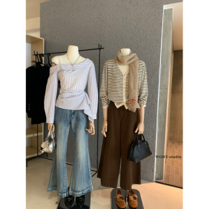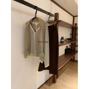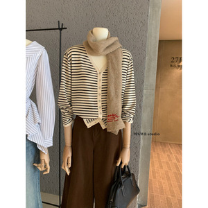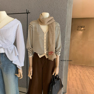 塞纳WGWE7071秋季韩版学院风V领单排扣条纹针织衫慵懒风长袖开衫