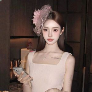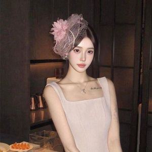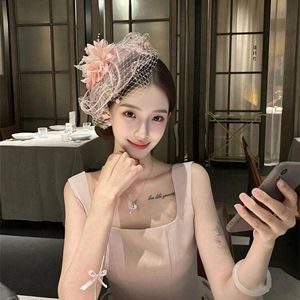 民国千金感粉色网纱小礼帽女法式名媛羽毛头纱宴会新娘高级感头饰
