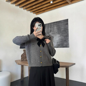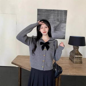灰色蝴蝶结针织开衫学院风海军领毛衣外套百褶半身裙两件套女秋冬