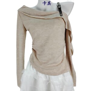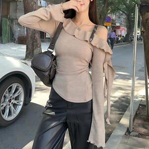 荷叶边褶皱长袖针织衫女秋季新款辣妹设计感小众修身掐腰露肩上衣