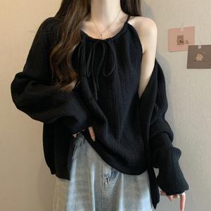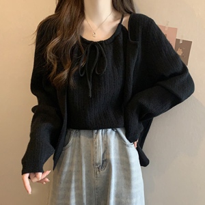 大码秋装新款温柔系带吊带背心套装女胖mm气质百搭开衫上衣两件套