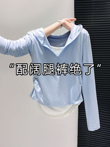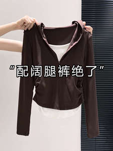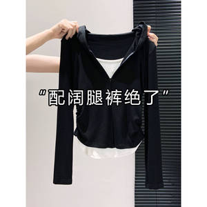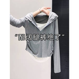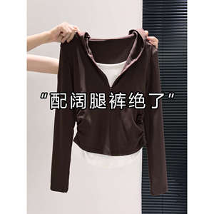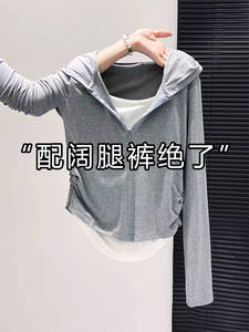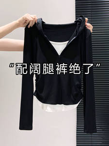 拉链拼接连帽假两件长袖t恤女春秋新款修身显瘦褶皱打底短款上衣