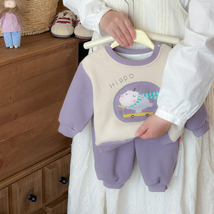 婴幼儿冬季加绒套装2025秋冬款男宝卡通卫衣裤子外出服两件套 a类