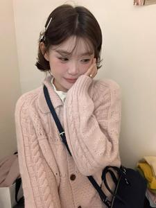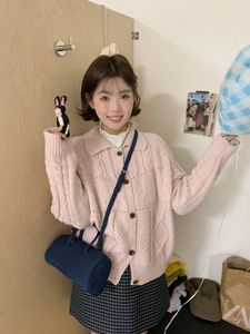 韩系甜美温柔粉色针织开衫毛衣女2025秋季翻领慵懒风外搭上衣外套