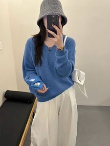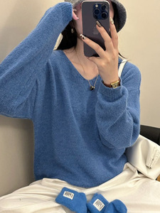 蓝色鸡心领毛衣女秋冬季2025新款时尚洋气宽松显瘦外穿上衣针织衫