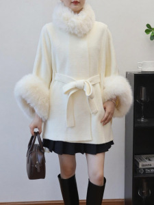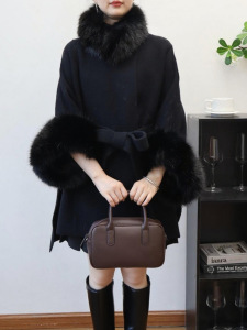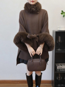 2025秋冬新款拼接毛毛小香风针织双面呢斗篷大衣高级感毛衣外套女